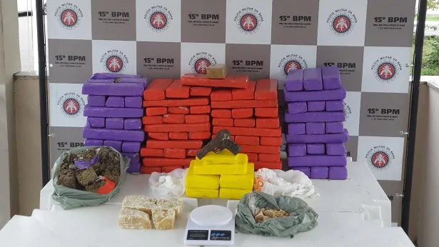Foram encontrados 118 tabletes de maconha, seis tabletes de pasta base de cocaína, três quilos de crack e uma pistola calibre 6,35.15 de junho de 2023 | Bahia |